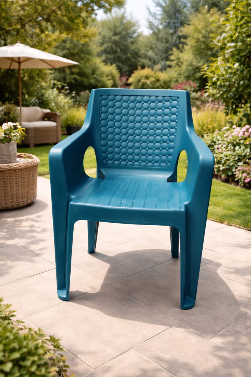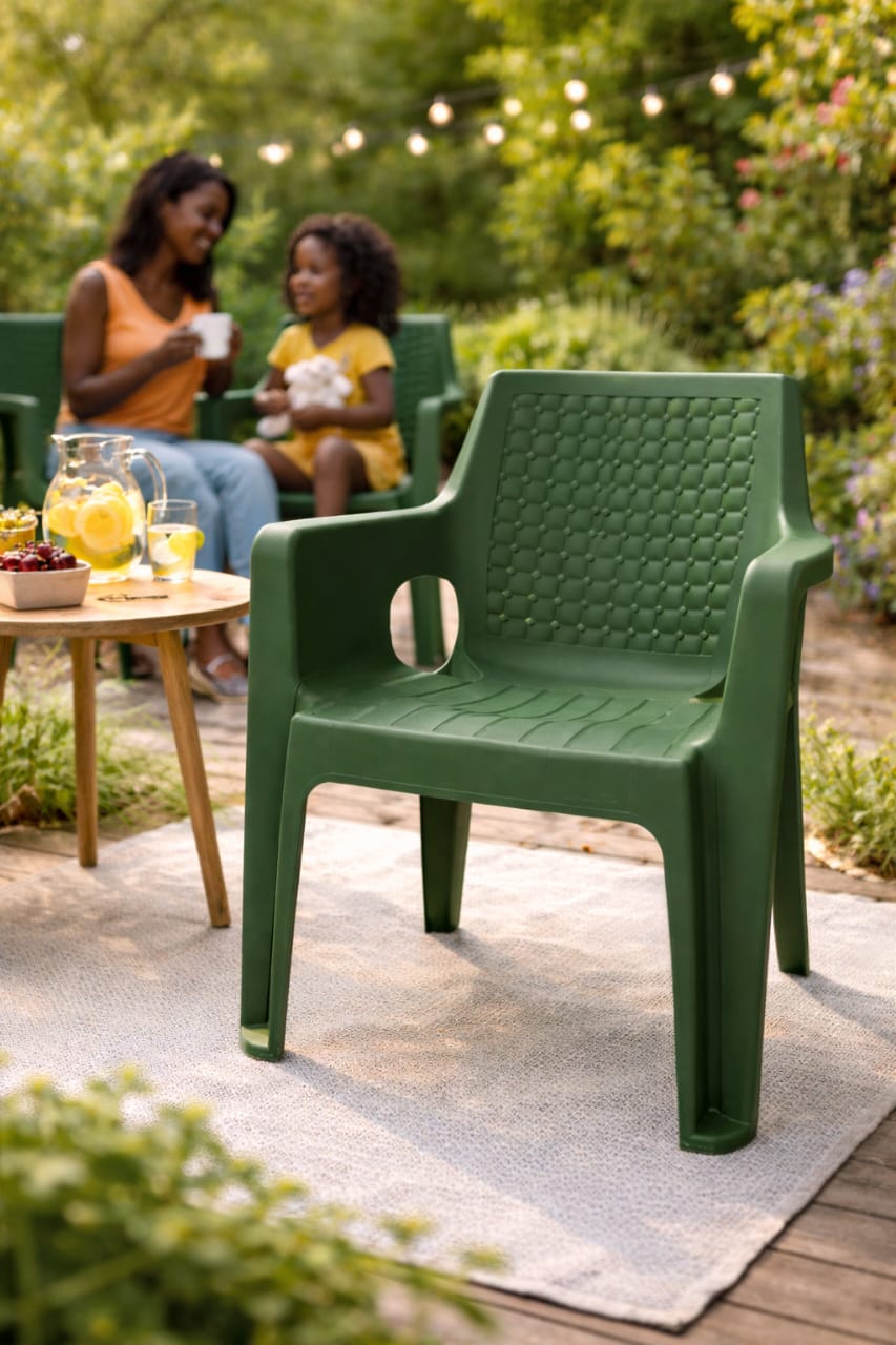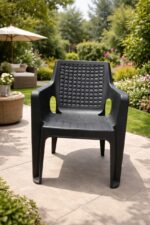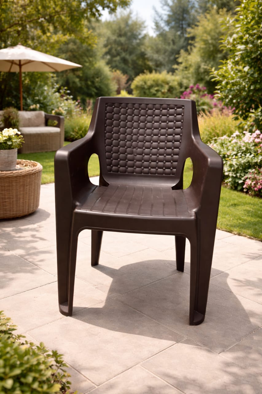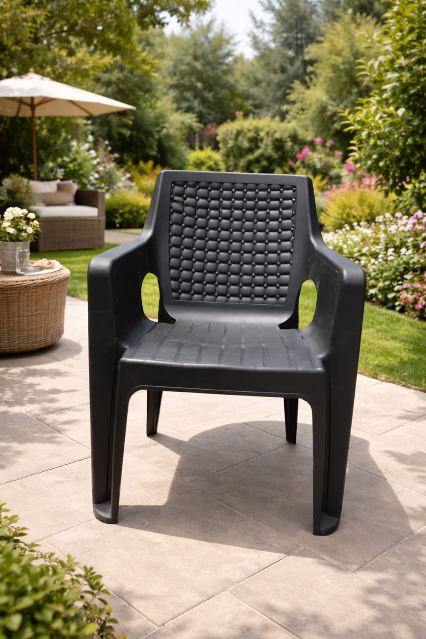 Chaise en plastique robuste avec accoudoirs, idéale pour un usage intérieur comme extérieur. Son design élégant avec dossier texturé offre à la fois confort et esthétique. Parfaite pour le jardin, la terrasse, le balcon ou même la maison.