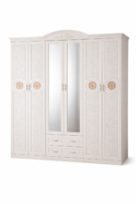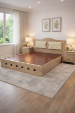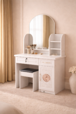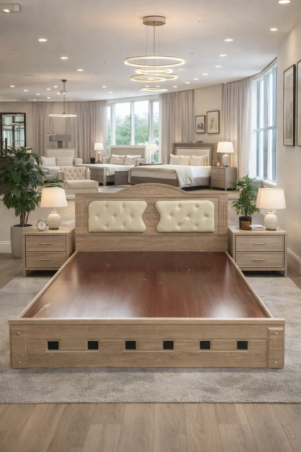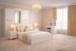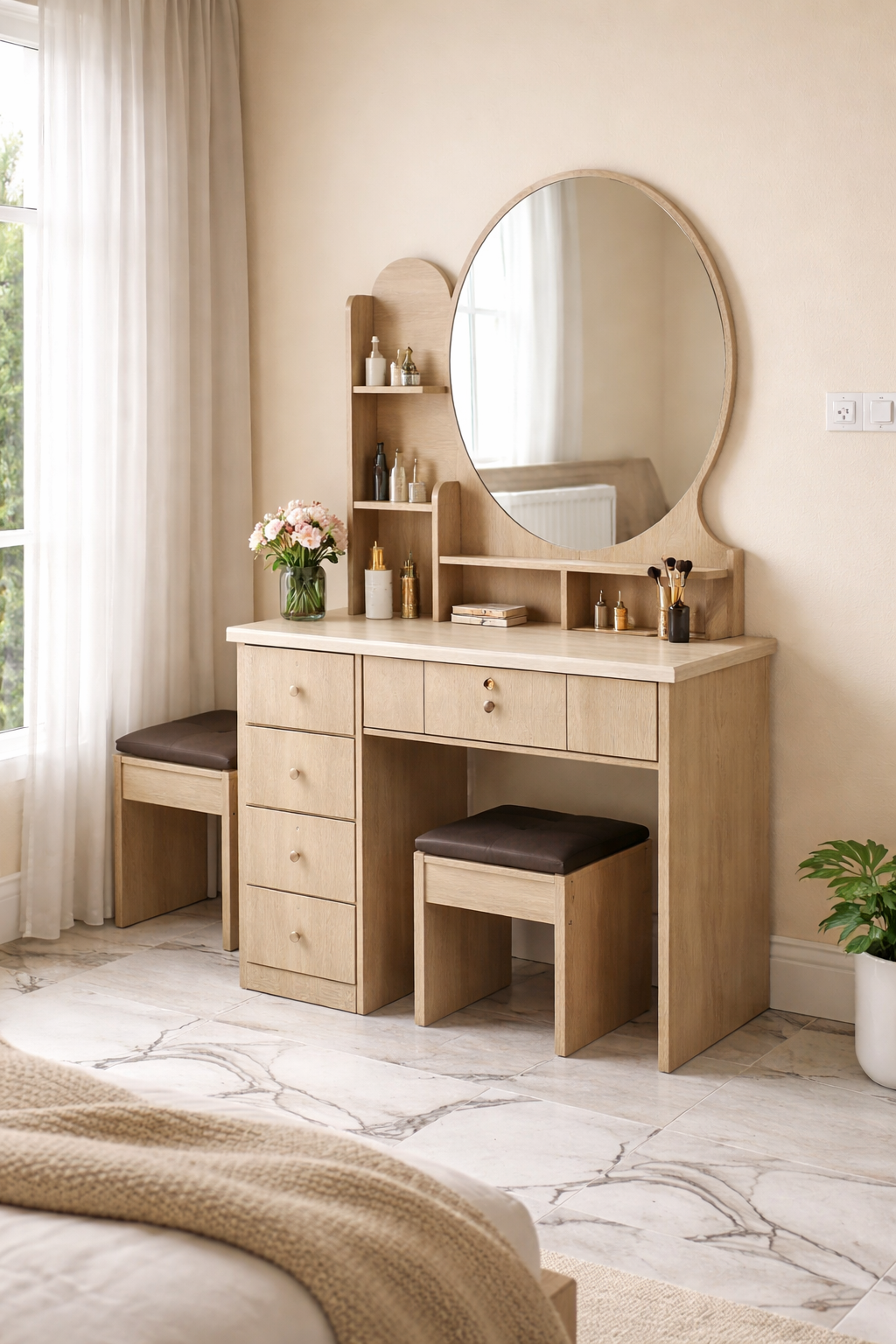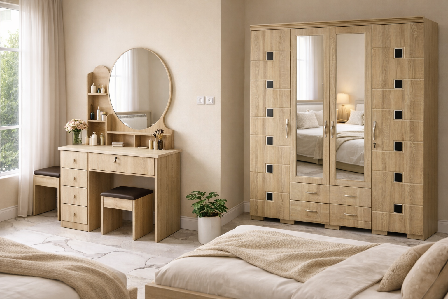 Ensemble de chambre au design moderne et épuré, composée d’un lit d’une armoire et d’une coiffeuse avec miroir assortie. L’ensemble présente une finition bois clair qui apporte chaleur et luminosité à la pièce. Le style est sobre et fonctionnel, adapté aussi bien aux chambres adultes qu’aux chambres d’amis.